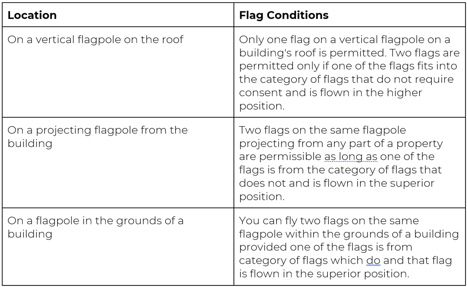 These are the flag categories that can now be flown without permission Depending on the size of the flag, the size of the characters on the flag, the number, and placement of the flags.