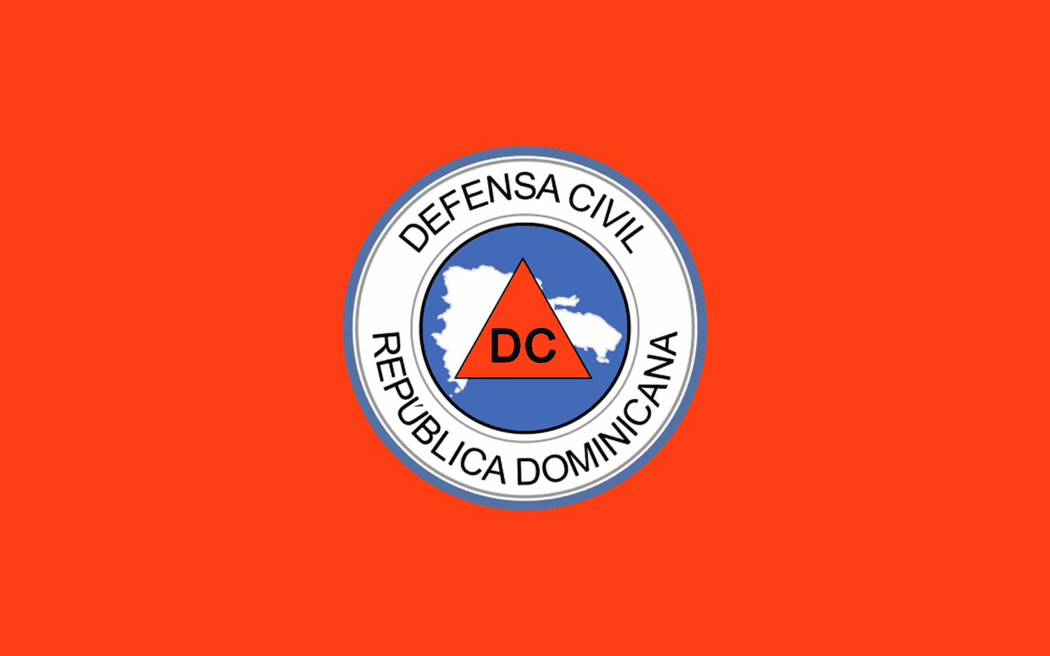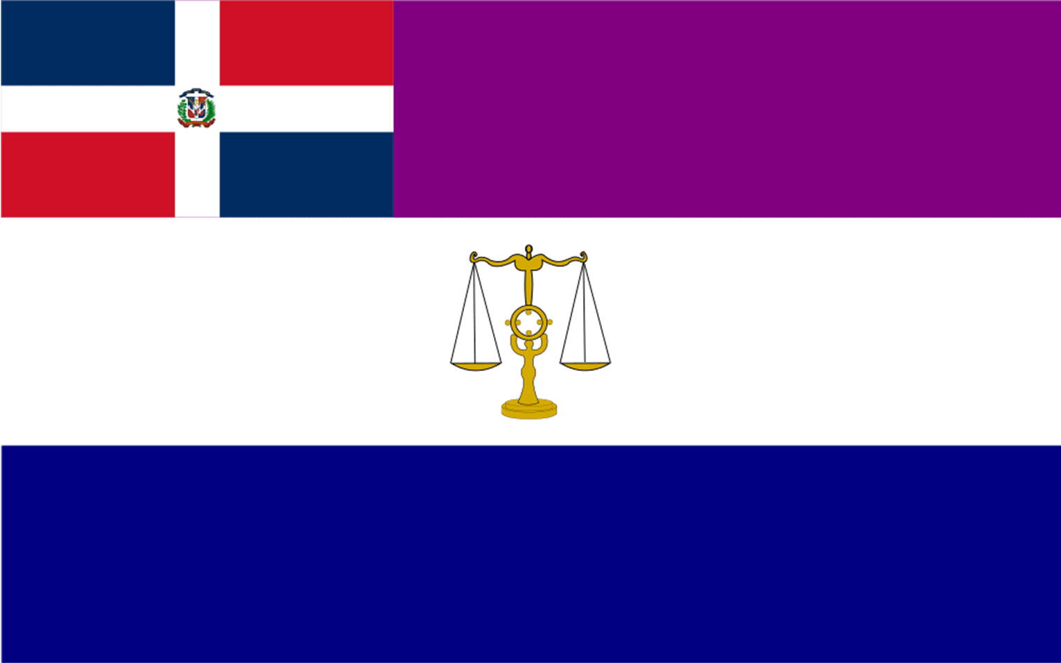 The Flag of the Dominican Civil Defénce is an orange field with a white bordered disc featuring an outline of the country behind an orange triangle with the letters DC. Inside the border is the text “DEFENSA CIVIL REPUBLICA DOMINICANA”. The Flag of the Judicial Power and Supreme Court features a purple-white-blue horizontal tricolour with national flag in the top left and scales in the centre.
