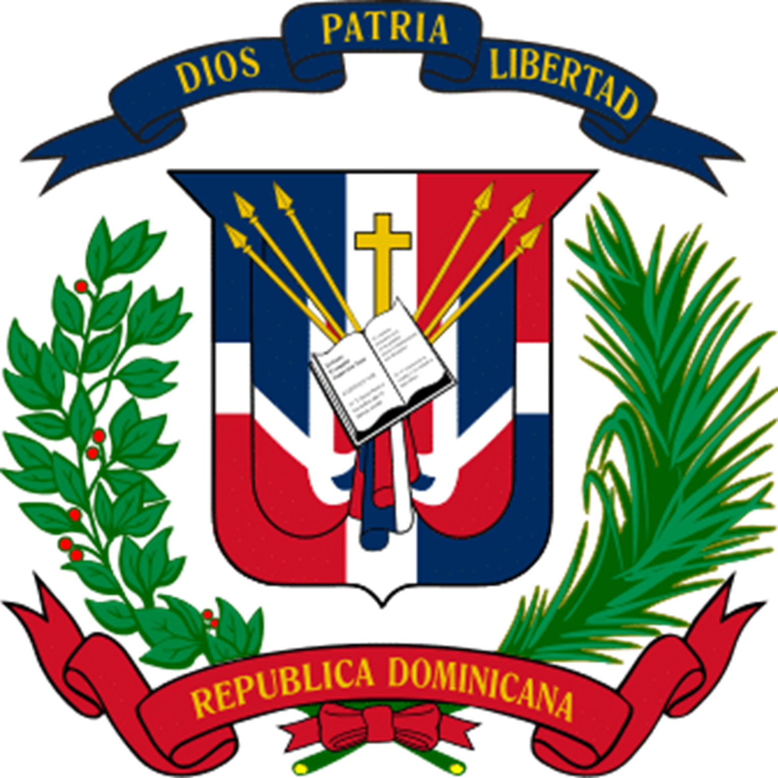 The flag has evolved over the years and the current version features a shield made from the national flag with a cross and a bible in front of six flag draped spears. On the left side is a bay laurel branch and a palm frond on the right. Above is a blue ribbon stating “DIOS PATRIA LIBERTAD” and below is a red ribbon stating “REPUBLICA DOMINICANA”.