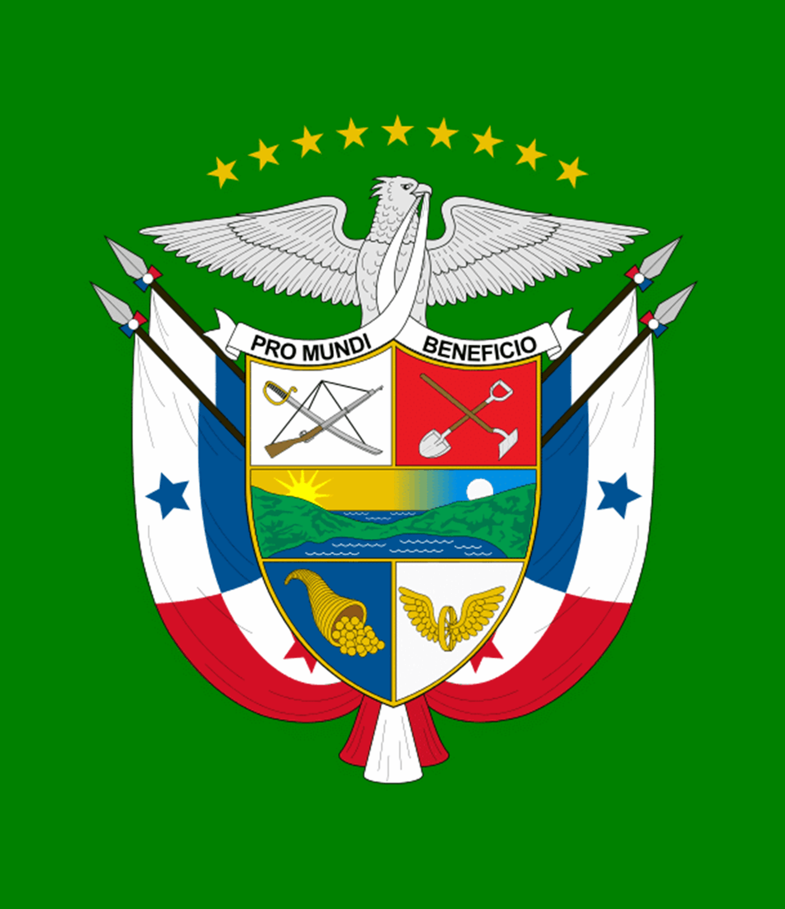 Above the shield is an eagle holding a banner stating “PRO MUNDI BENEFICIO” and nine gold stars. At either side of the flag are two draped national flags. Occasionally the flag is on a green background.