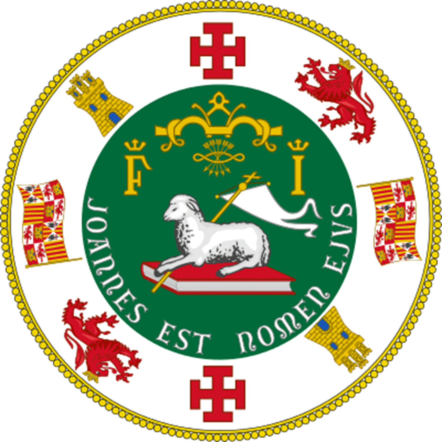 The current version of the coat of arms of Puerto Rico was adopted in 1976. It features a crowned shield surrounded by a crowned F and Y and a banner at the bottom stating “JOHN IS HIS NAME”. The shield depicts the lamb of god sitting on the book of revelation holding a Saint George’s cross surrounded by symbols of Crown of Castile and León.
