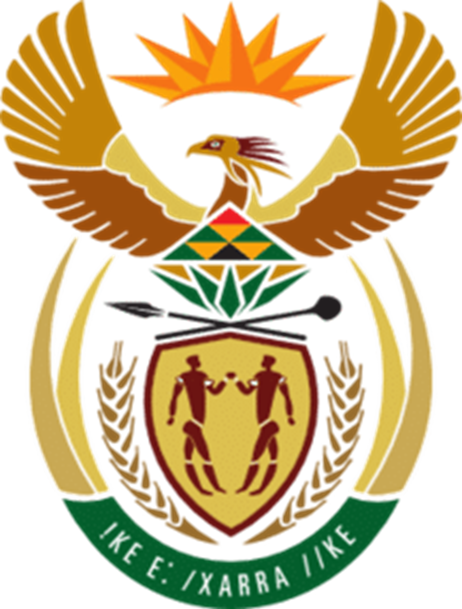 The Coat of Arms of South Africa as adopted in 2000 and features a red-bordered gold shield with two red human figures. At either side are elephant tusks and ears of wheat; above are spears, a Protea flower, a Secretary bird and a rising sun.