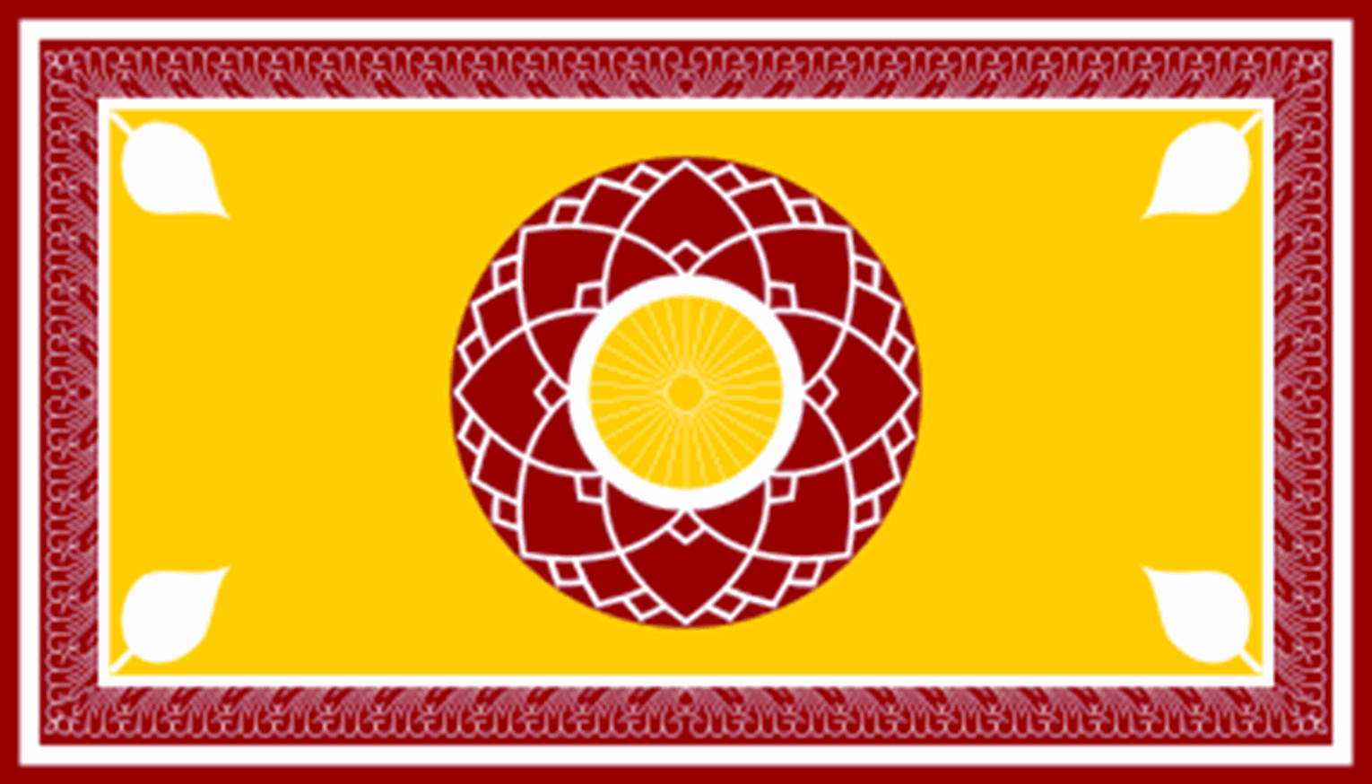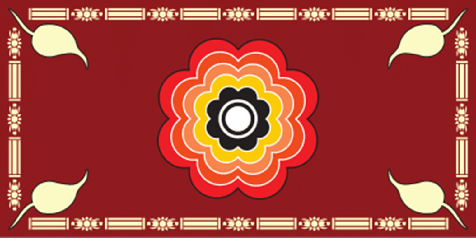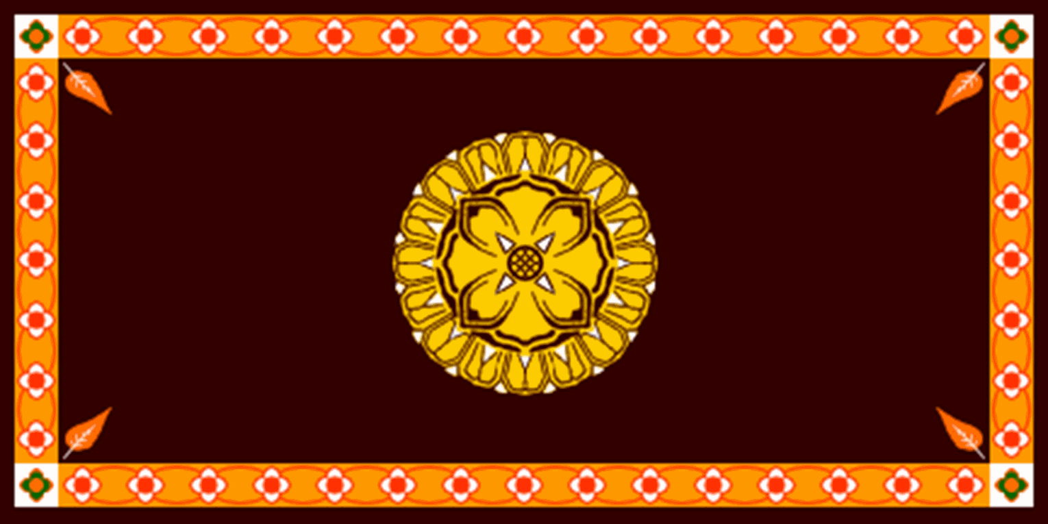 It features a maroon filed with ornamental yellow border, leaves in each corer and a red, yellow and black lotus in the centre.
