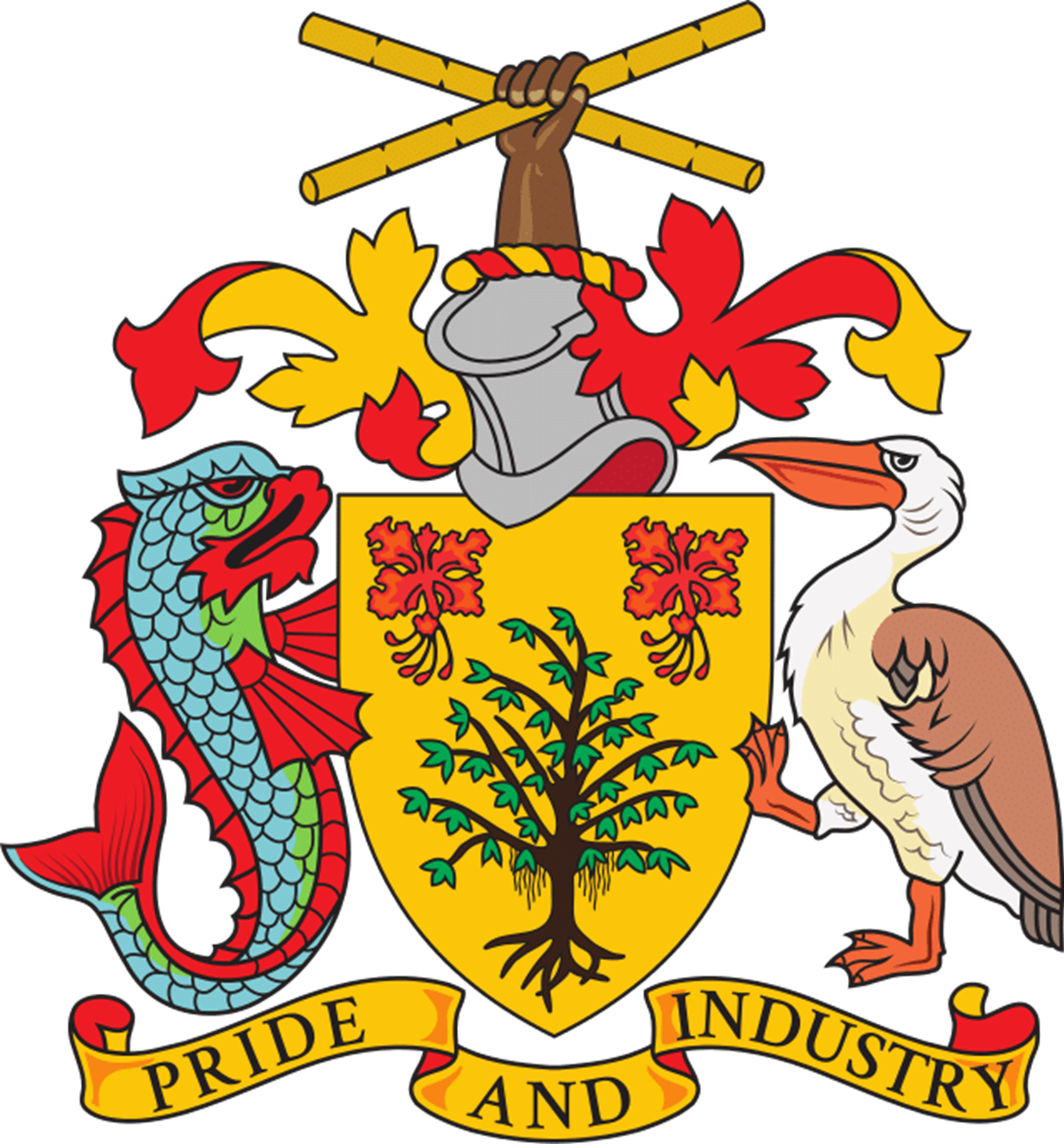 The Coat of Arms of Barbados was designed by Mr Neville Connell and adopted in 1966. It features a gold shield with Pride of Barbados flower and bearded fig tree in the centre. A dolphin on the left and a pelican on the right hand side of the shield referencing the islands fishing industry and the Pelican Island. Above the shield is a helmet with a national symbol of a hand holding two stalks of sugar cane on top. Underneath a banner reads “PRIDE AND INDUSTRY”.