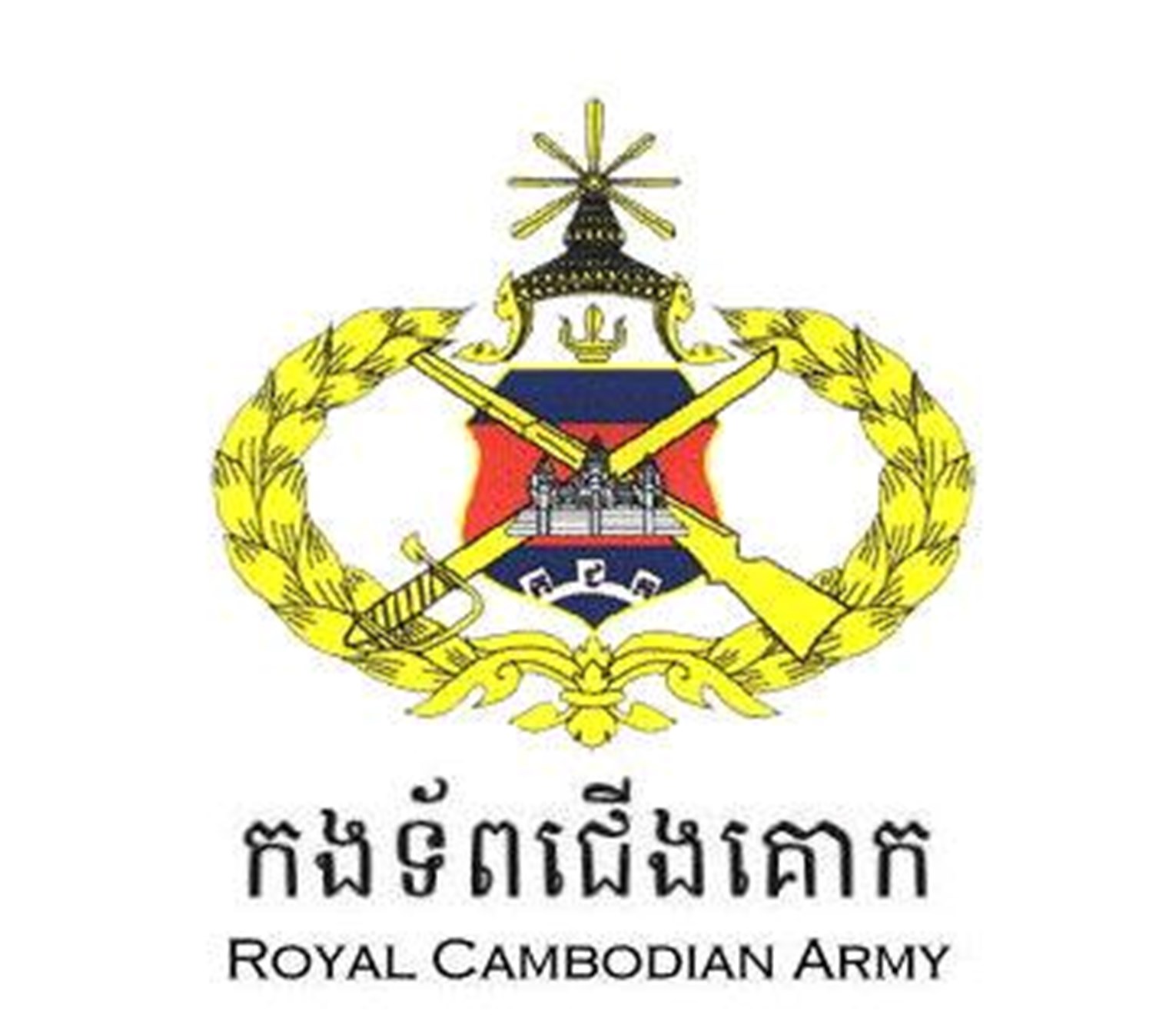 The logo of the Royal Cambodian Army features the outline of Angkor Wat with crossed gun and sword behind surrounded by a laurel wreath and royal crown above.