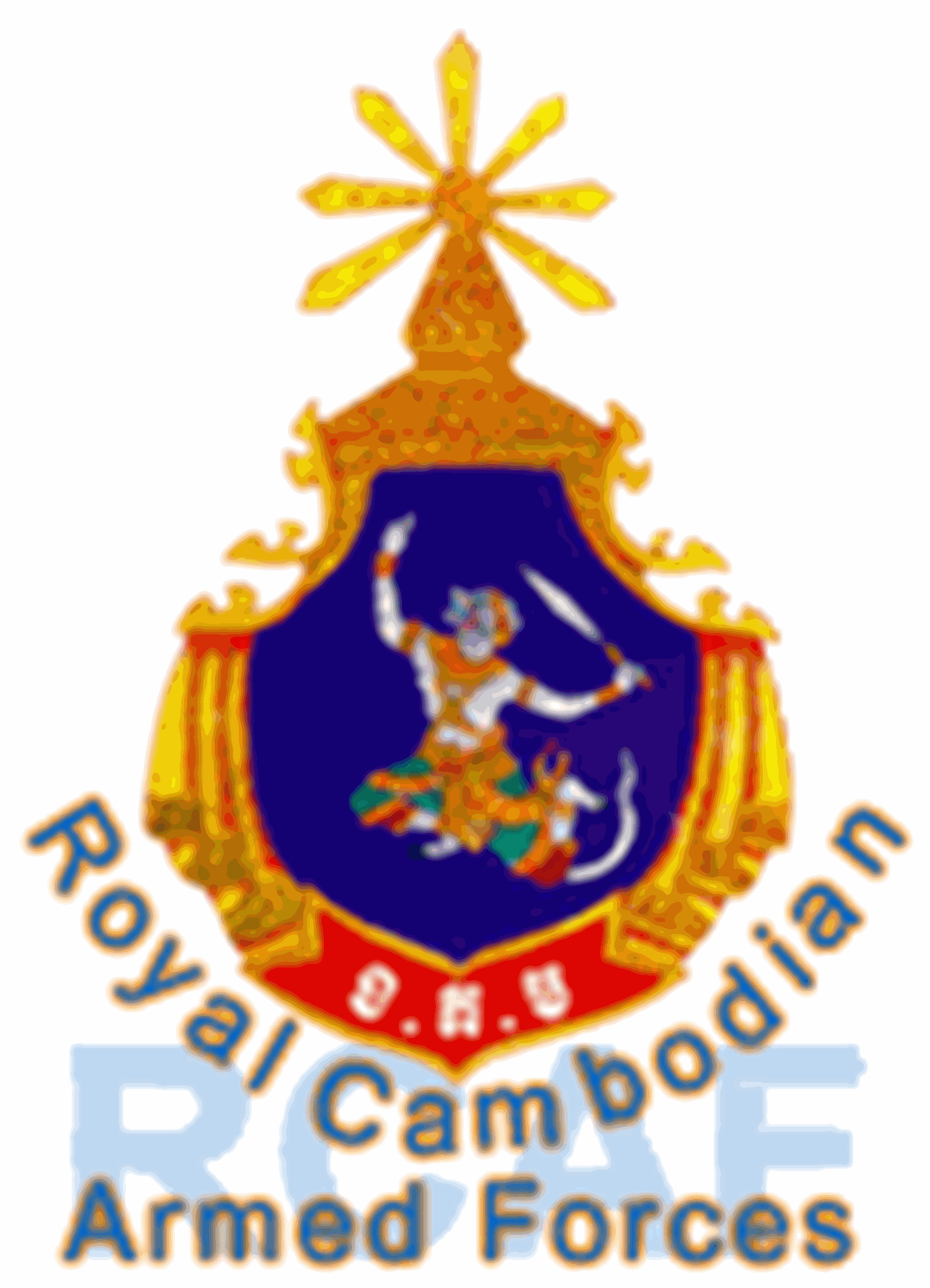 The logo of the Royal Cambodian Armed Force features a figure holding a sword on a blue background with a royal crown above.