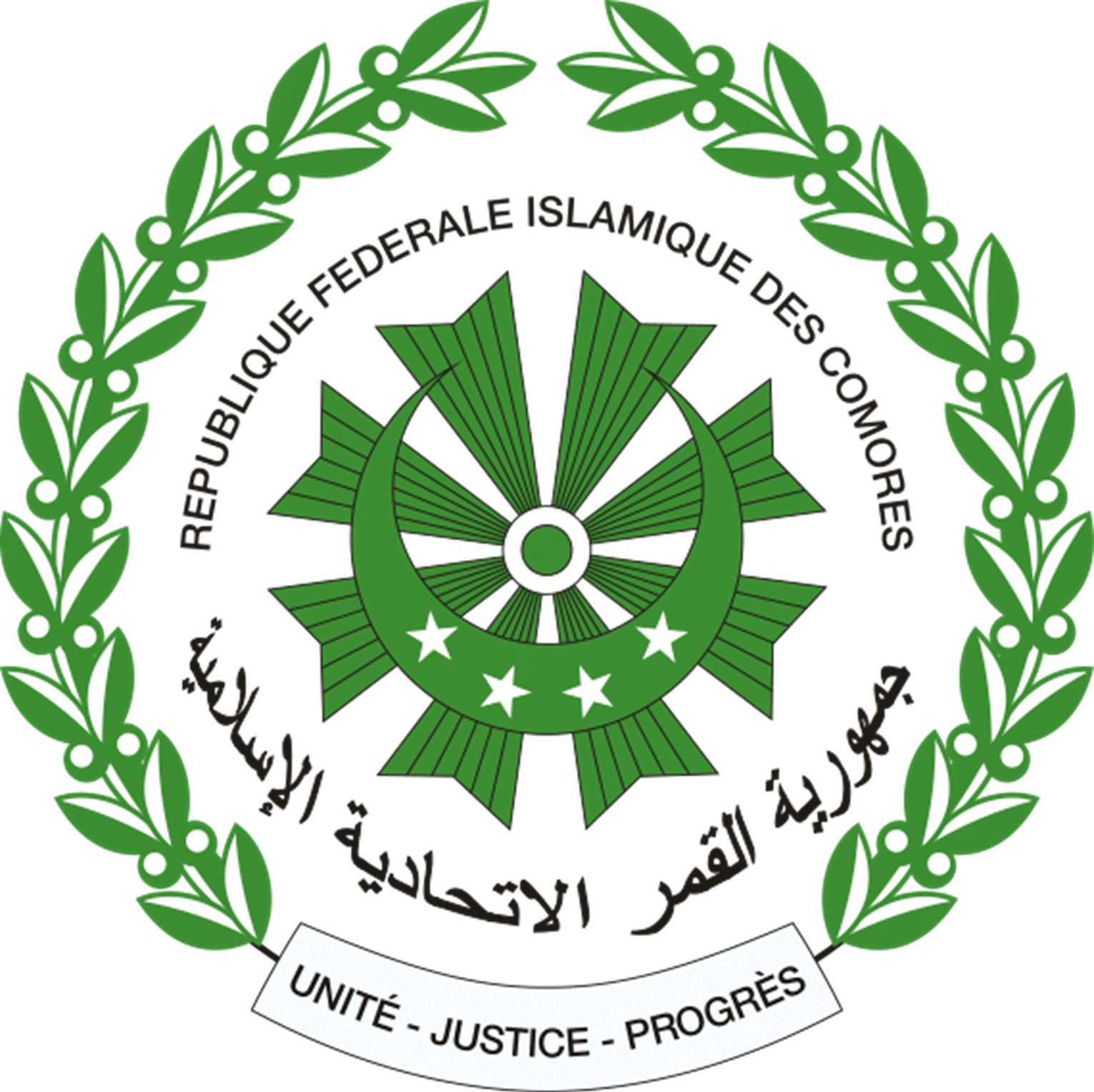 The national motto, ‘UNITÉ – JUSTICE – PROGRÈS’, is underneath the seal and ‘REPUBLIQUE FEDERALE ISLAMIQUE DES COMORES’ is above.