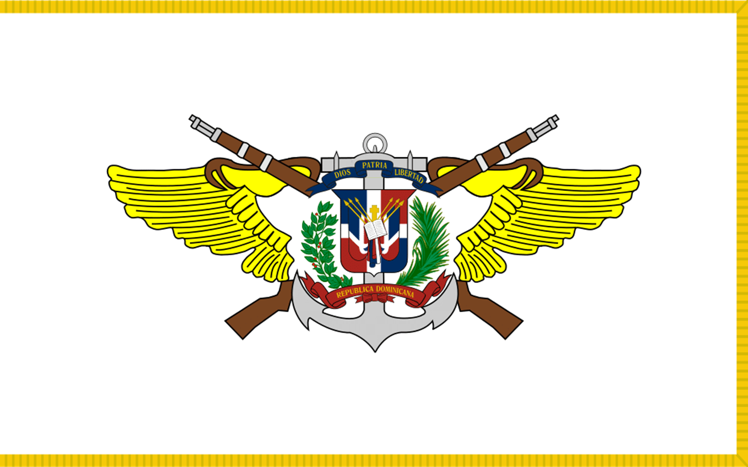 The Flag of the Military of the Dominican Republic is a gold-bordered white field with the coat of arms protecting a set of wings, anchor and crossed guns. The Flag of the Dominican Army is the national flag with the coat of arms in the lower left portion and red-white-green-yellow horizontal stripes in the upper right portion.