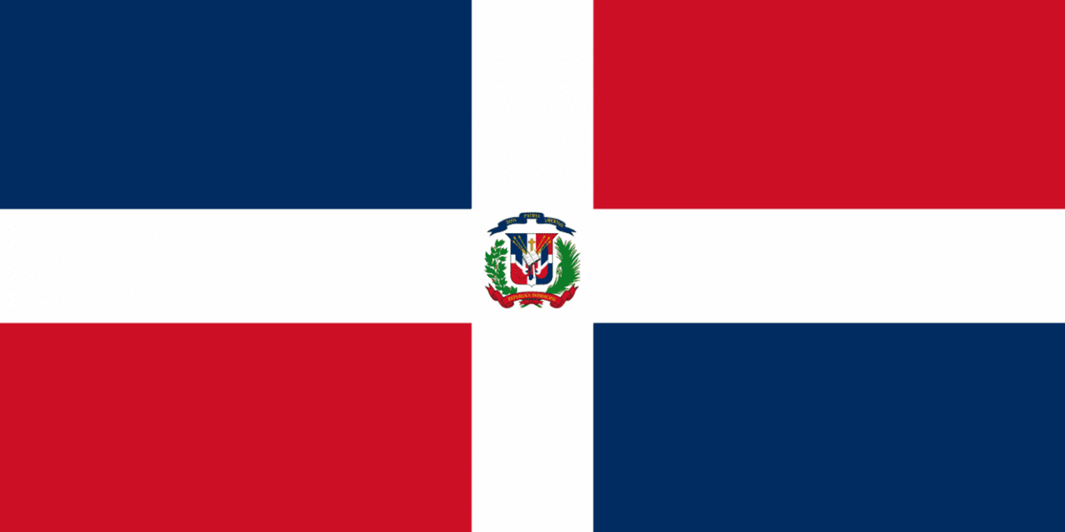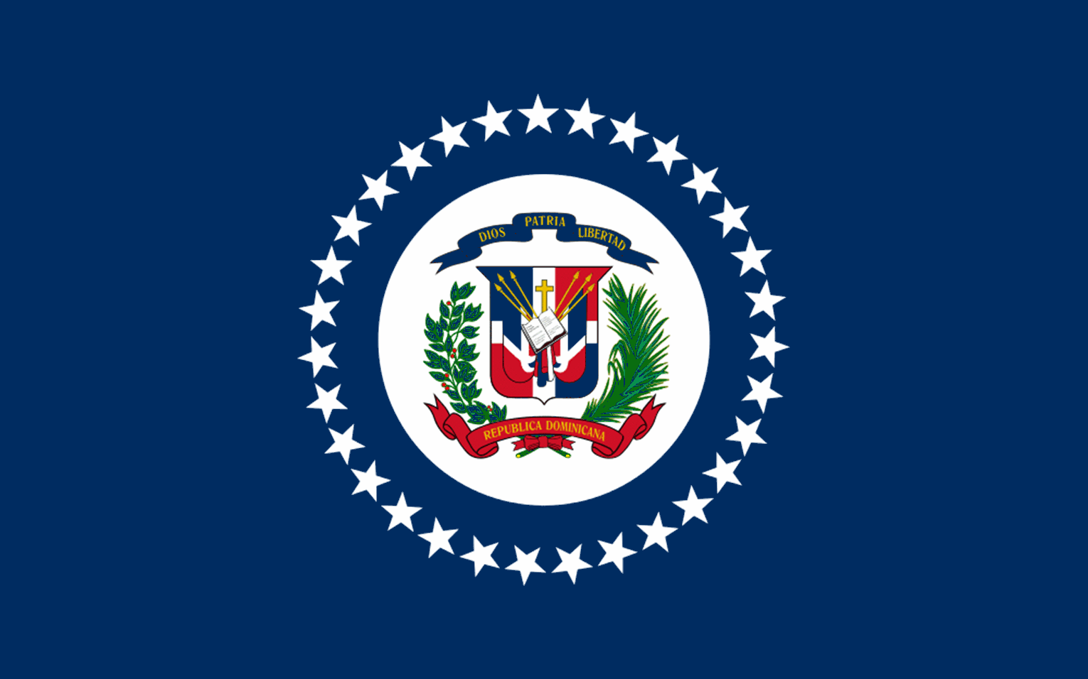 The flag has evolved over the years and the current version features a shield made from the national flag with a cross and a bible in front of six flag draped spears. On the left side is a bay laurel branch and a palm frond on the right. Above is a blue ribbon stating “DIOS PATRIA LIBERTAD” and below is a red ribbon stating “REPUBLICA DOMINICANA”.
