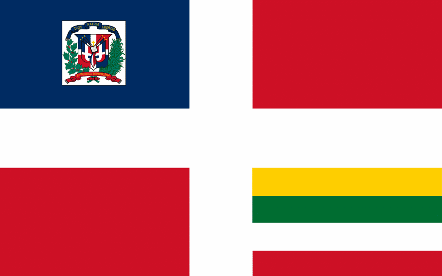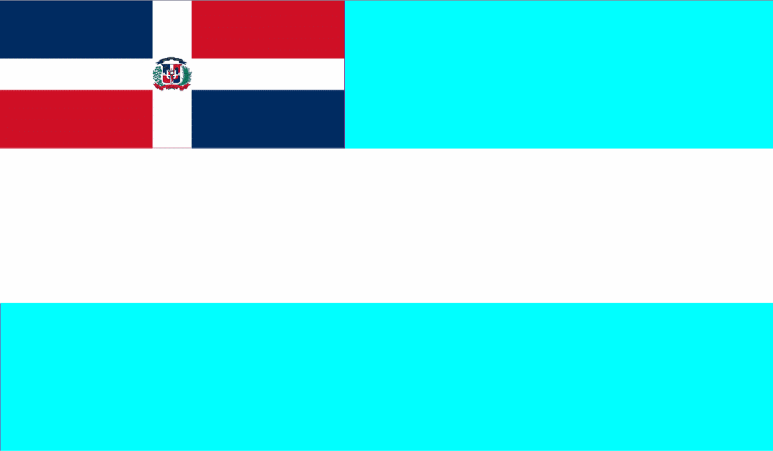 The Flag of the Dominican Air Force is a plain white field with red stripe and coat of arms in the centre, a civil national flag in the top left and roundel bull’s-eye in the lower centre. The Naval Ensign of the Dominican Navy is the national flag.