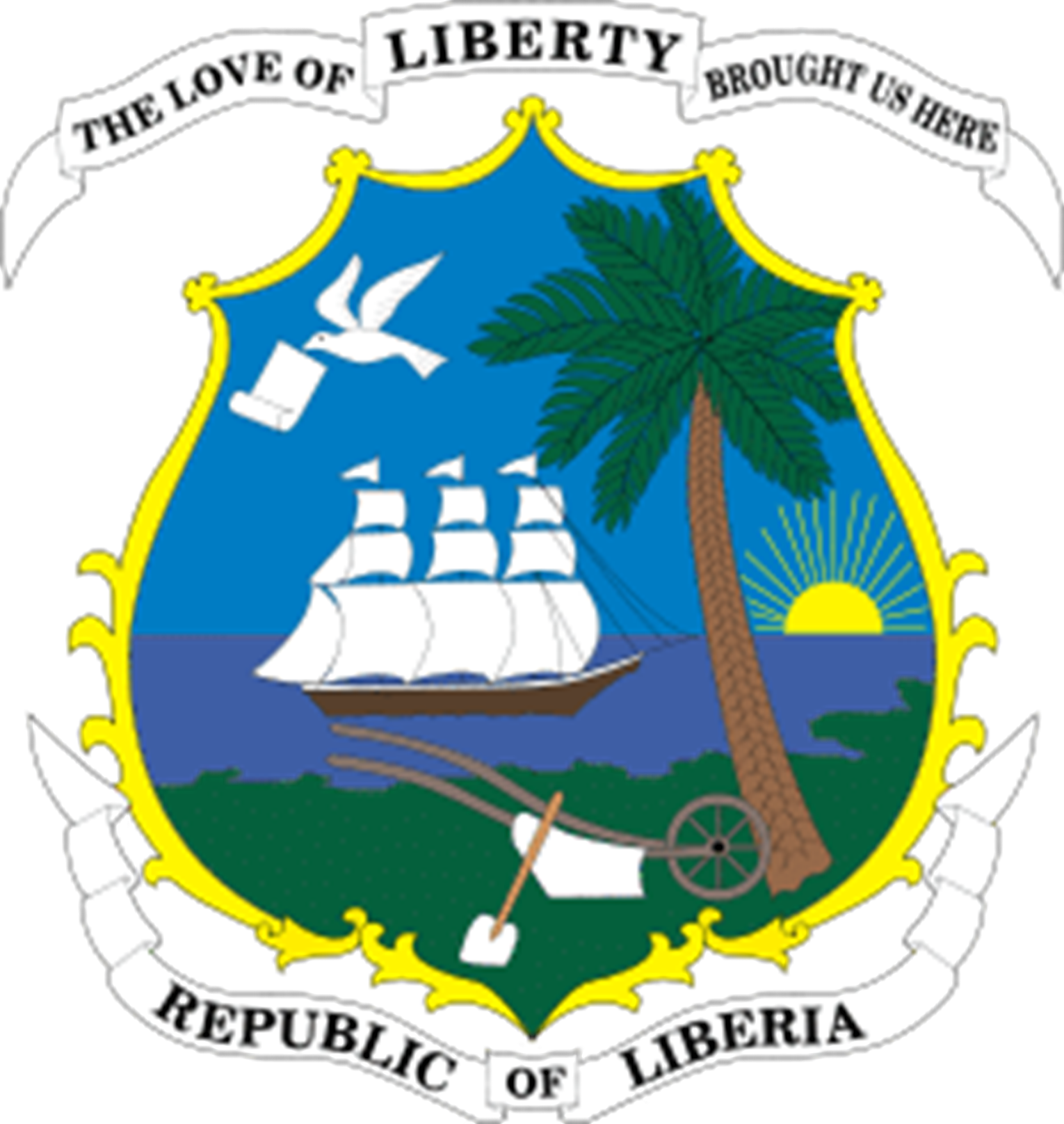 Above the shield is the motto “THE LOVE OF LIBERTY BROUGHT US HEAR” and below is “REPUBLIC OF LIBERIA.”
