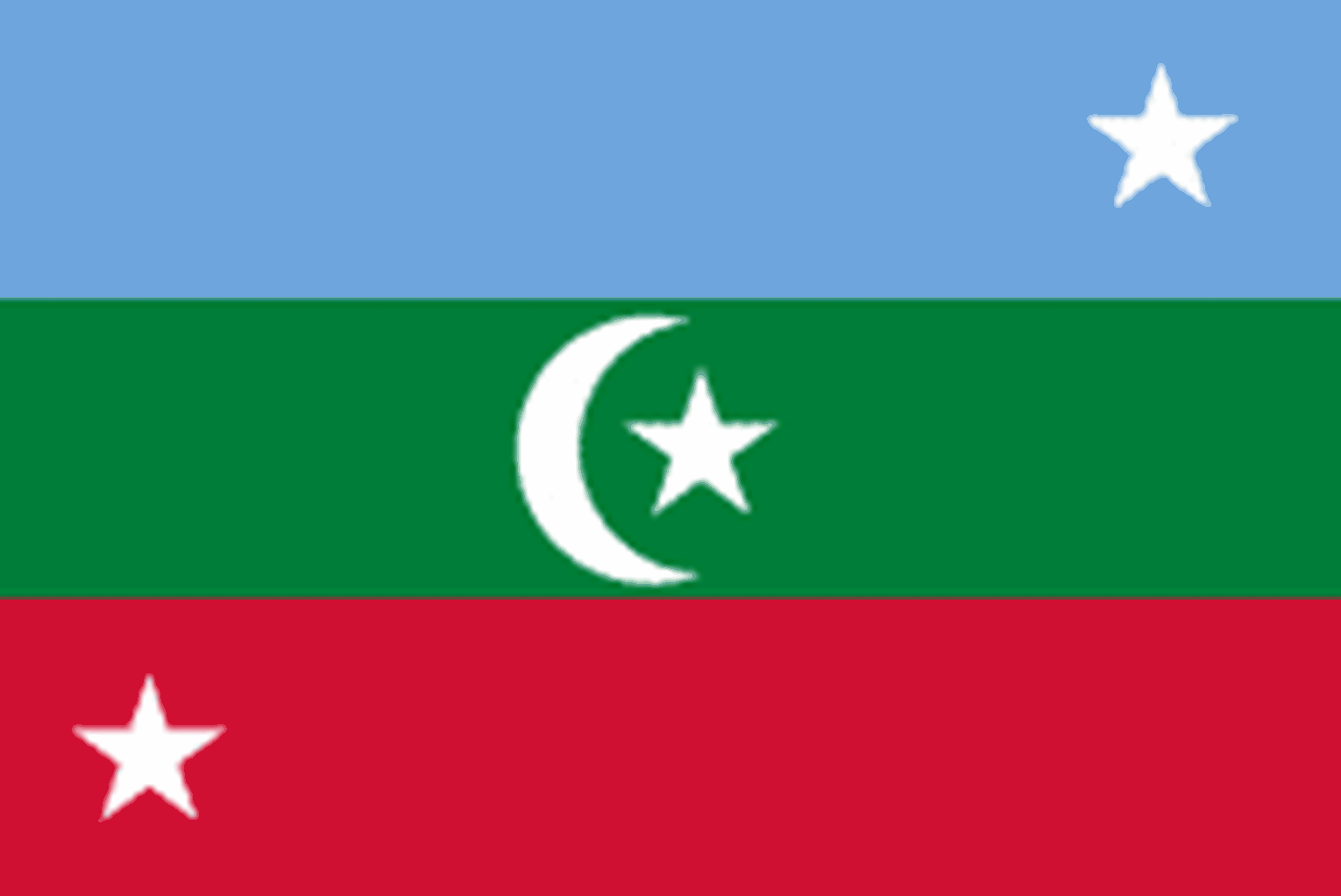 In 1959 the southern atolls of the Maldive Islands broke away to create the United Suvadive Republic. The flag adopted was a blue-green-red horizontal tricolour with three five-pointed white stars in a diagonal line and a white crescent in the centre.