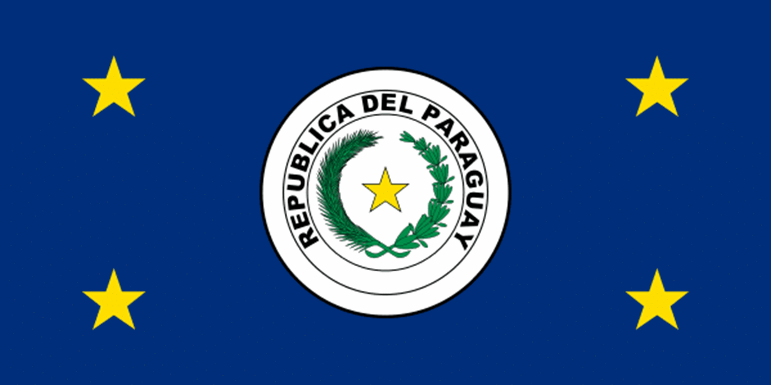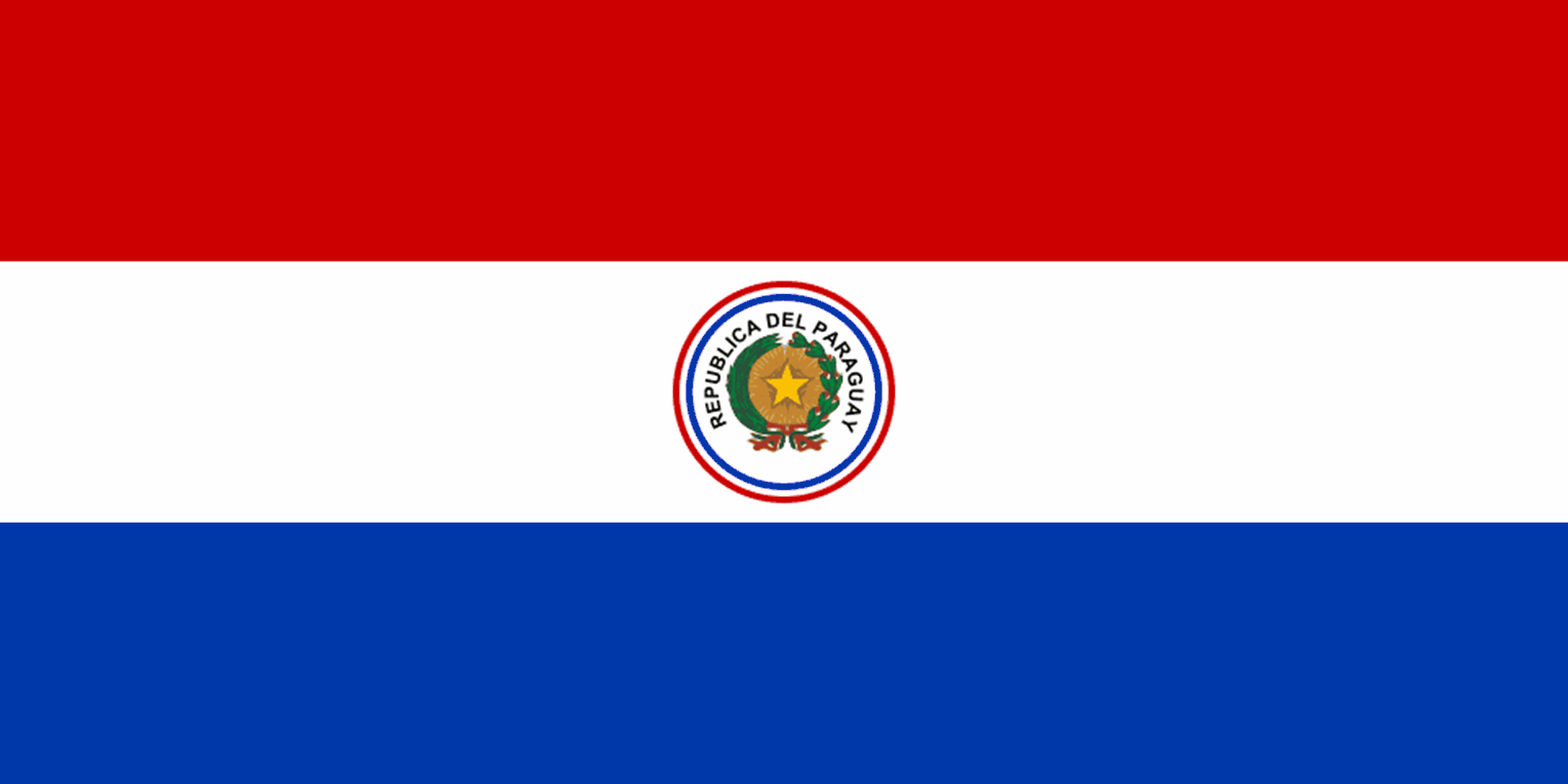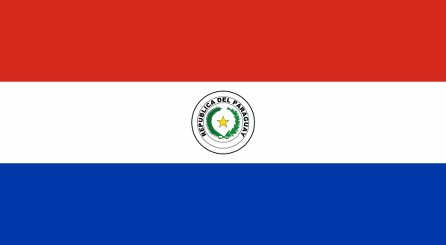 In 1842 the proportions of the red-white-blue tricolour was changed to 2:3. An emblem was added to the flag that featured a golden circle with five-pointed star surrounded by an olive brand and a palm branch with the words “REPUBLIC DE PARAGUAY” above.