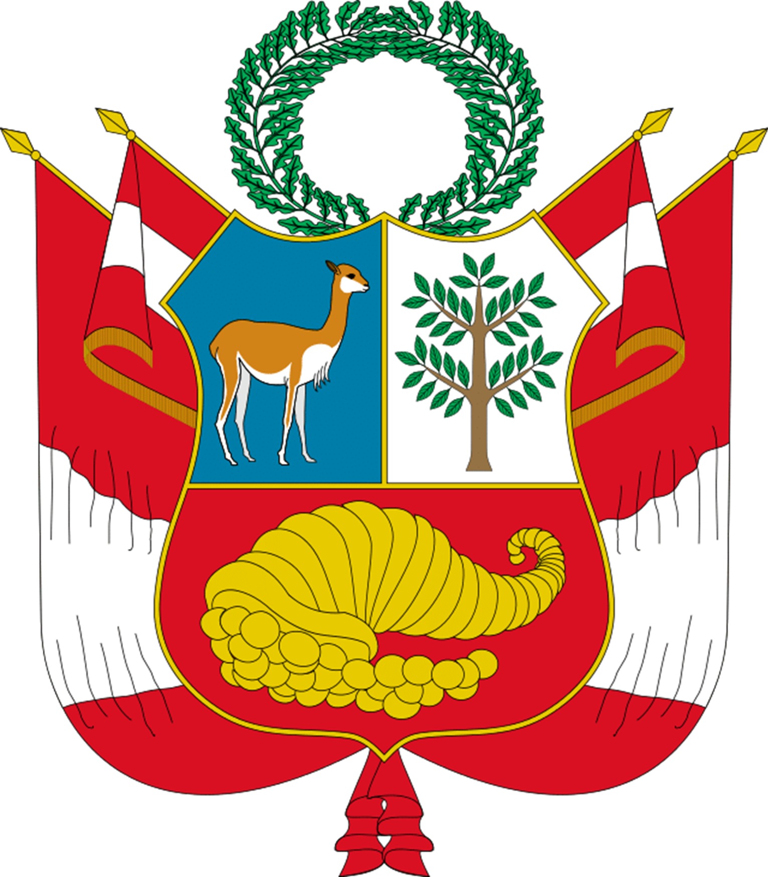 The Coat of Arms of Peru features a shield divided into three parts. The top left part featured a vicuña on a blue background, top right depicted a cinchona tree and lower part featured a shell on a red background. Above is a laurel wreath and at either side are draped national flags.