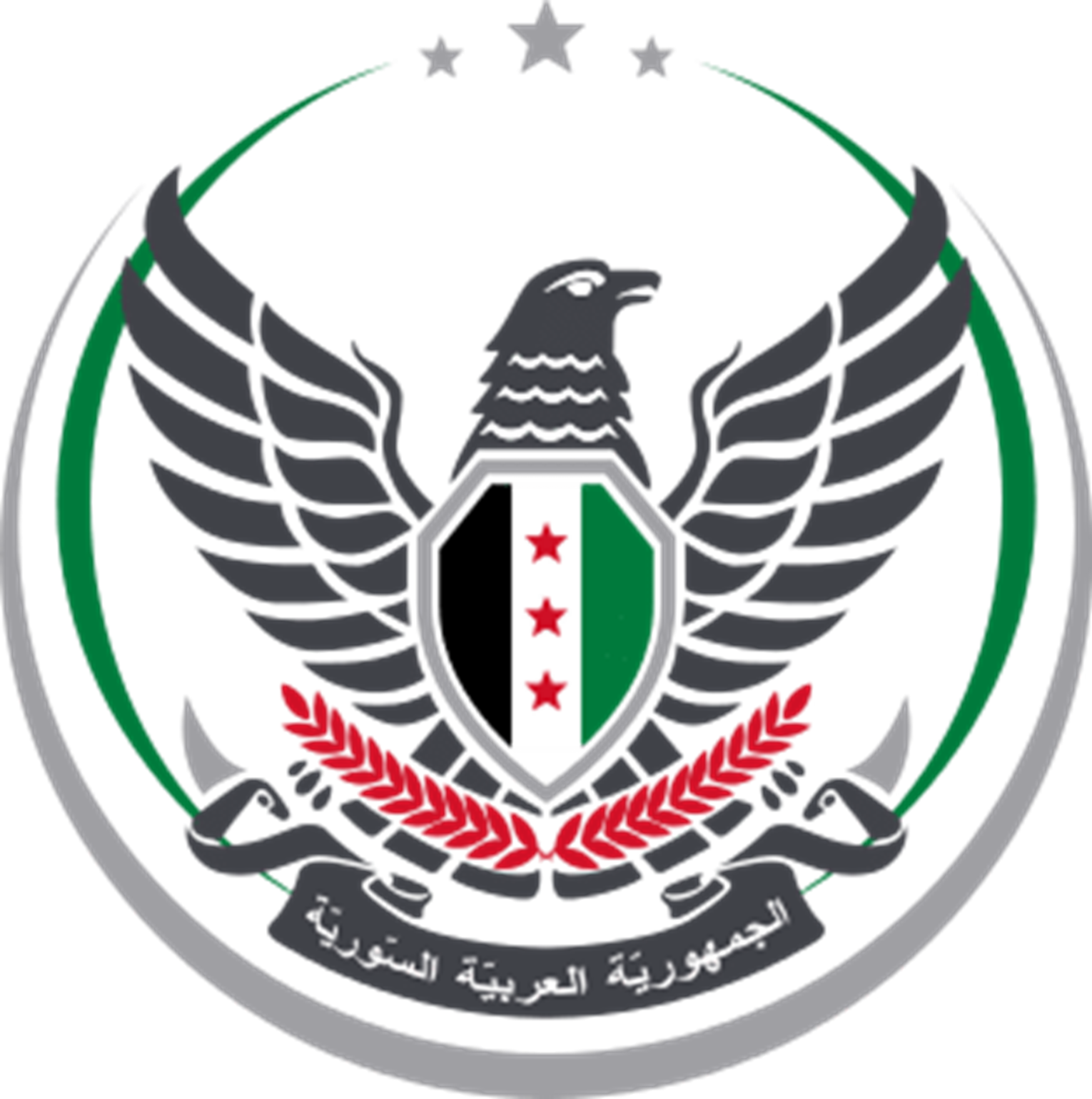 The Coat of Arms of the Syrian Interim Government and National Coalition is a grey version of national coat of arms with the wings of the hawk in flight and the name of the coalition and government in the black banner.