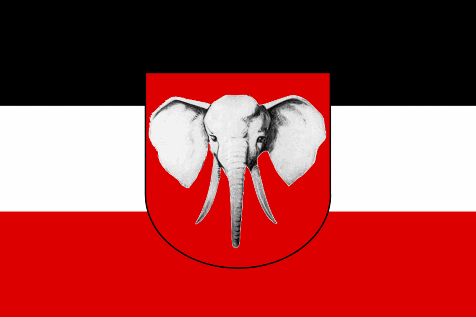 Just before the start of World War One Germany had proposed a Coat of Arms for the German Colonies. It featured a shield split into two with the Reichsadler eagle at the top and the symbol on the country at the bottom, the elephant was chosen for Cameroon. On top of the flag was a crown.
